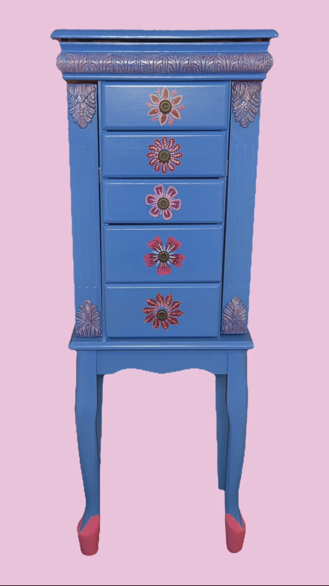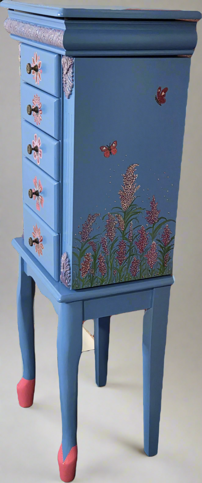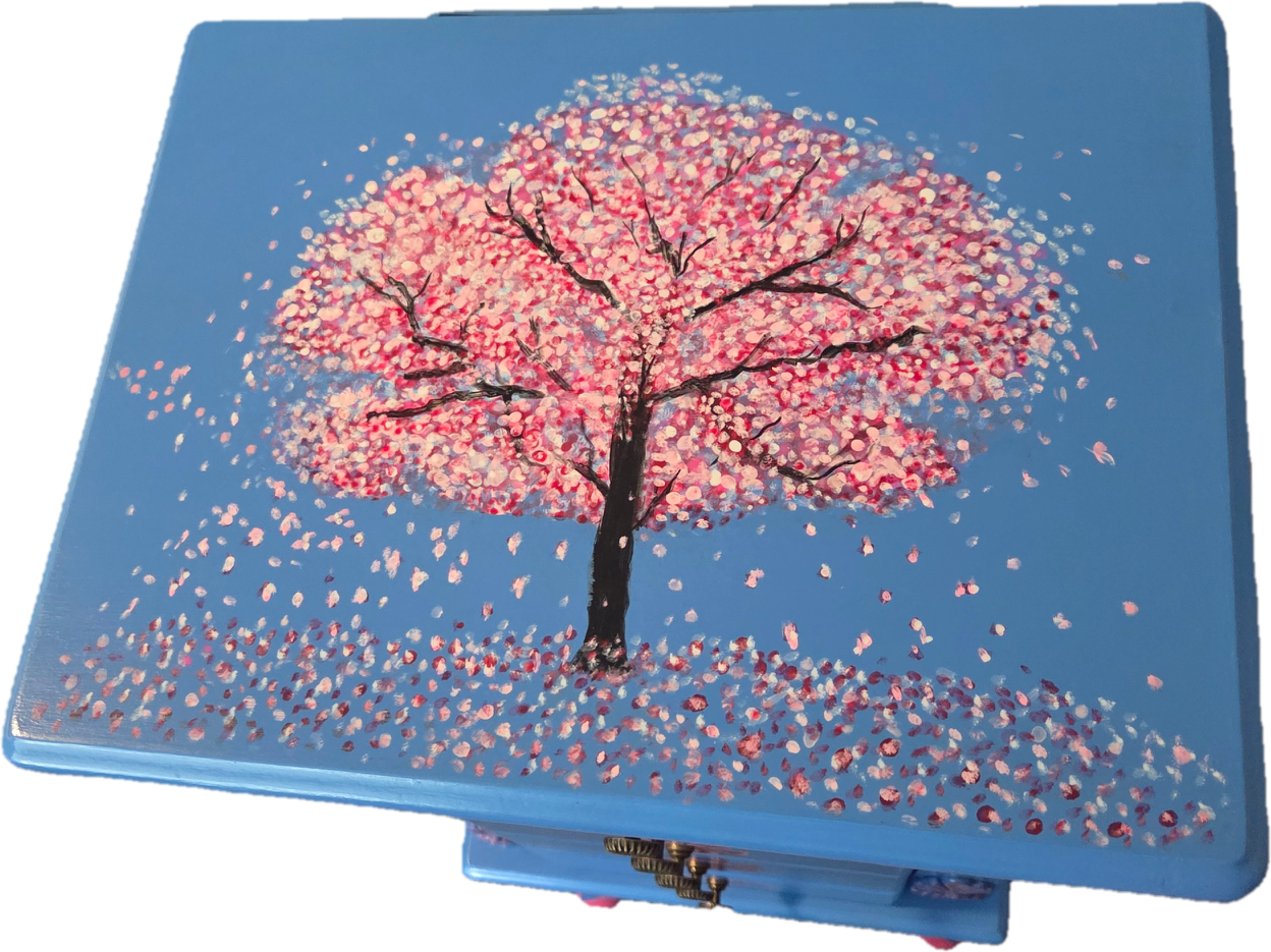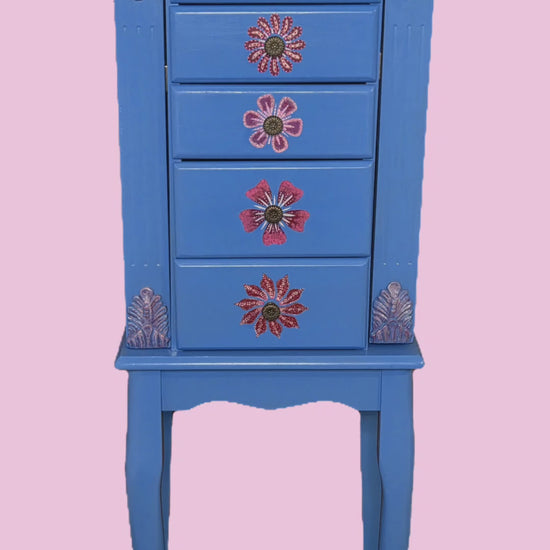 This petite, hand-painted jewelry armoire radiates peace and elegance. Its blue tone is complemented by delicate floral touches, with each drawer featuring a unique artistic flourish. The top Is crowned with a graceful cherry blossom tree, and inside the lid rests a portion of a meaningful Bible verse. The back showcases two butterflies, with another hidden inside the side doors—each a symbol of renewal and grace. Though the paint is known for its durability, a protective top coat has been thoughtfully applied to preserve the finish and ensure lasting beauty.